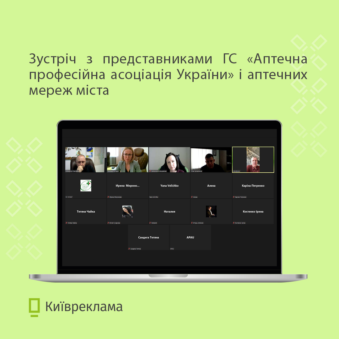 Сьогодні відбулася онлайн-зустріч за участю керівника Управління з питань реклами Оксани Поліщук, представників Громадської спілки «Аптечна професійна асоціація України» (АПАУ) і представників великих мереж аптек міста Києва.